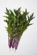●葉柄が鮮やかな赤紫色に色づき、葉形に深い欠刻が入る。ポリフェノールの一種であるアントシアニンを多く含む機能性ミズナ。