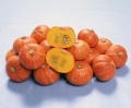 ●果実は赤皮のミニカボチャで300g前後になる。果肉はオレンジ色の粘質系で甘味が強くおいしい。