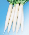 ●草姿は半立性で葉色は濃緑色、葉柄は丈夫である。根身長く純白で艶よく、肉質は緻密で根端まで肉付きよい。根長45cm、根径7~8cm位(播種後40~45日の頃)で揃いよく安定した収量を確保でき、市場出荷や漬物用として期待できる。