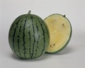 ●果重1.8~2kg程度の小玉種。果形は高球でよく整う。外皮は鮮緑地に濃緑の細縞が入る。
